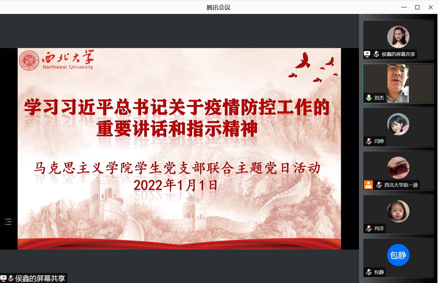 在全校上下齐心抗疫的关键时期,为坚定我院学生战胜疫情的信心,提升齐心协力打赢疫情防控阻击战的士气,发挥学生党支部的战斗堡垒作用和学生党员的先锋模范作用,2022年1月1日,马克思主义学院三个学生党支部联合开展学习习近平总书记关于疫情防控工作的重要讲话和重要指示批示精神主题党日活动。学院党委书记刘杰、党委委员李建森、王振民、刘娟作为学生党支部联系人参加了此次活动。活动由院党委副书记邵平主持。