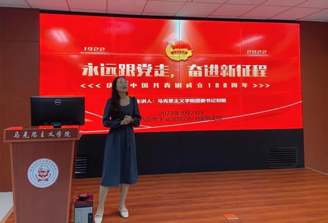 刘娟介绍了马克思主义学院的基本情况,并对2022级新生的加入表示欢迎。接着,她讲述了100年来党领导中国青年运动的光辉历程,提到新时代共青团员理应牢记党的教诲,趁着青春年华,迎着风雨与阳光奋力奔跑,以“青春之我”成就民族之梦、国家之希望,并对2022级新生提出了三点希望:第一,希望大家踊跃参加新生纳新活动,锻炼自己的才能,丰富工作经历,提升自身的综合能力。第二,她强调同学们要抓住大好时机认真学习、刻苦钻研,努力学习专业理论知识,积极参加社会实践,将理论与实践相结合,做到知行合一。第三,她详细介绍了学院发展党员的基本过程,并希望同学们时刻牢记党的教诲,紧跟党走,争做新时代的有为青年,同时也希望新生增强团员意识,进一步明确团员责任与义务,不断增强团组织的组织力和凝聚力。