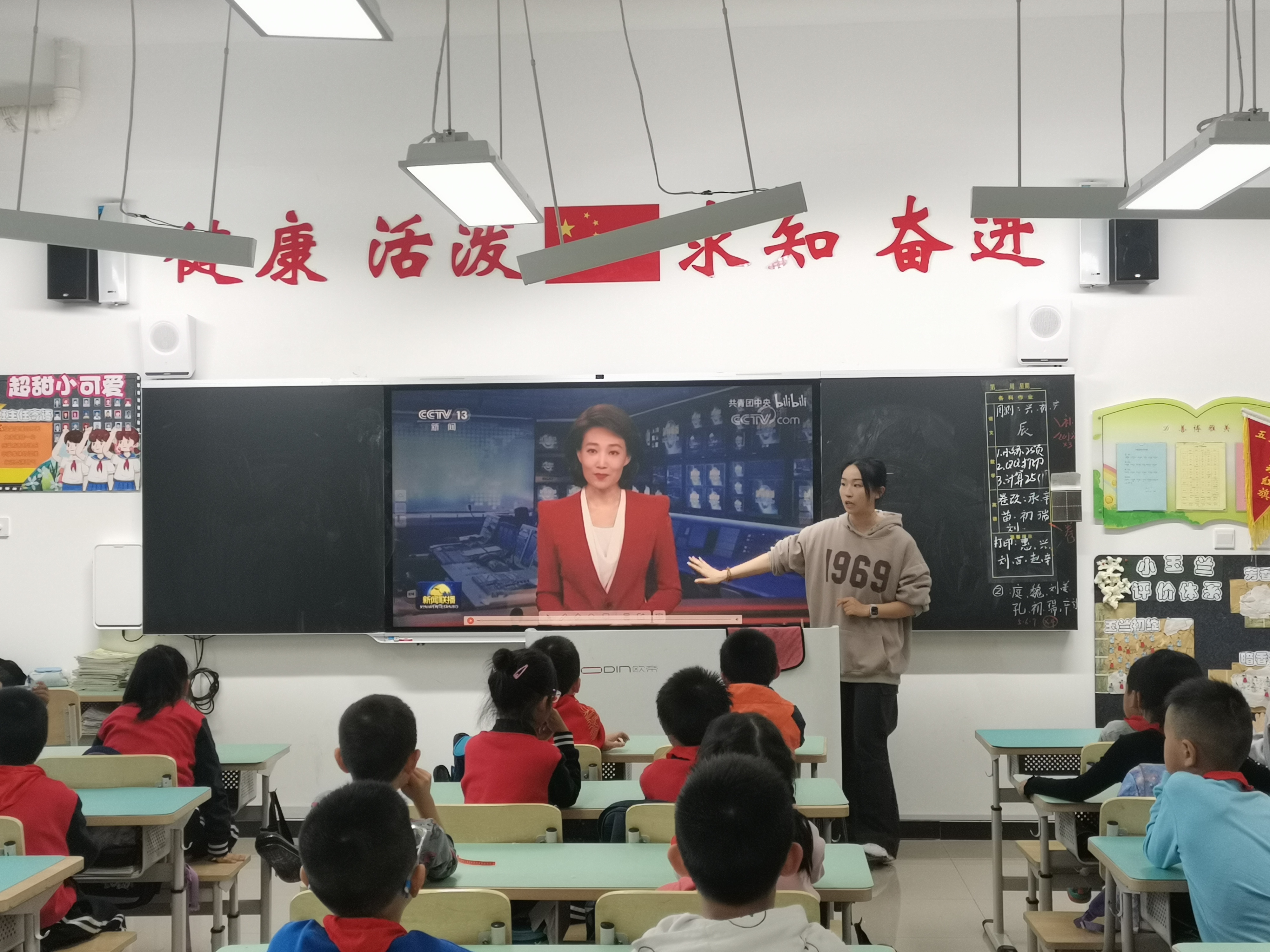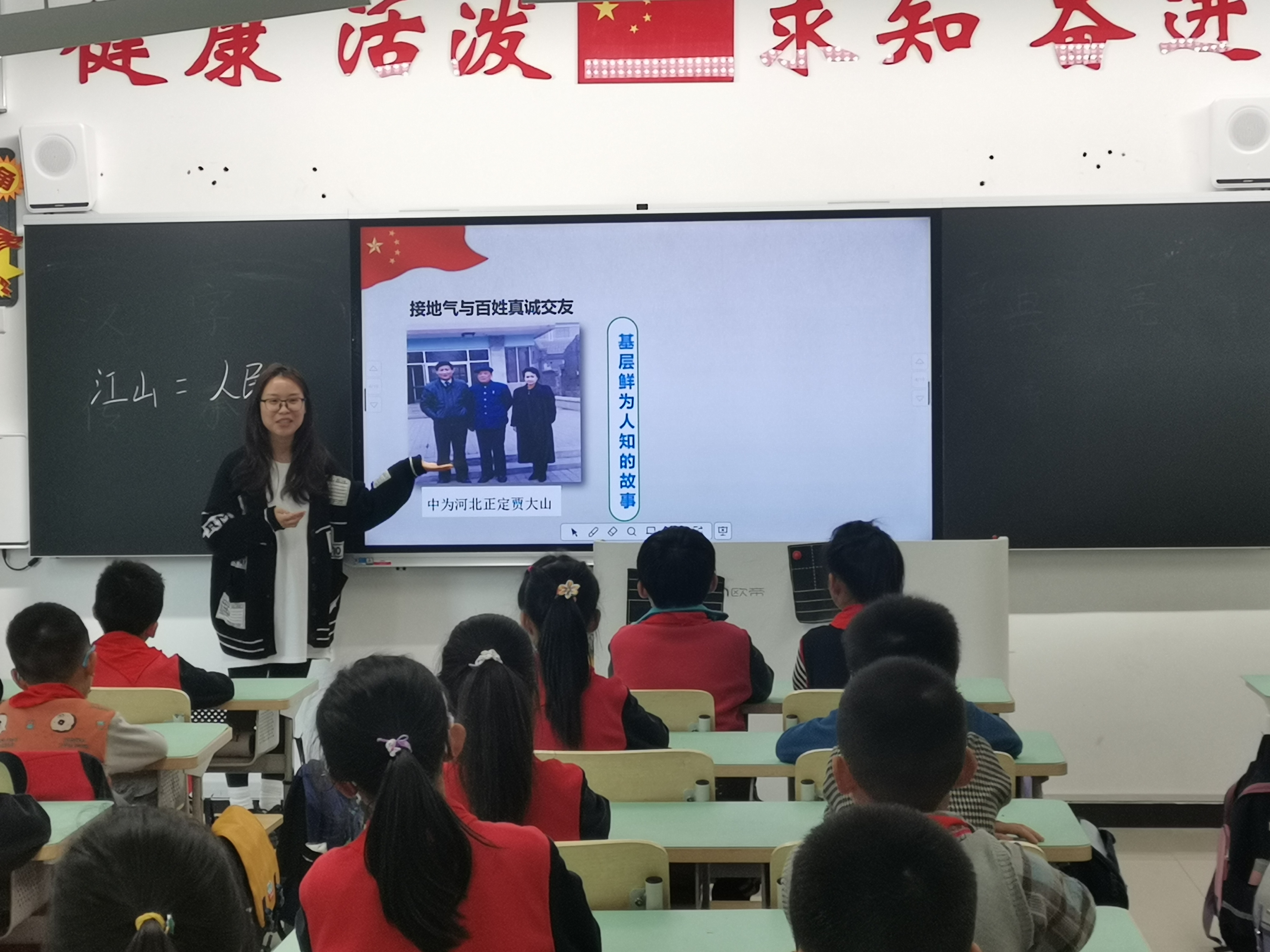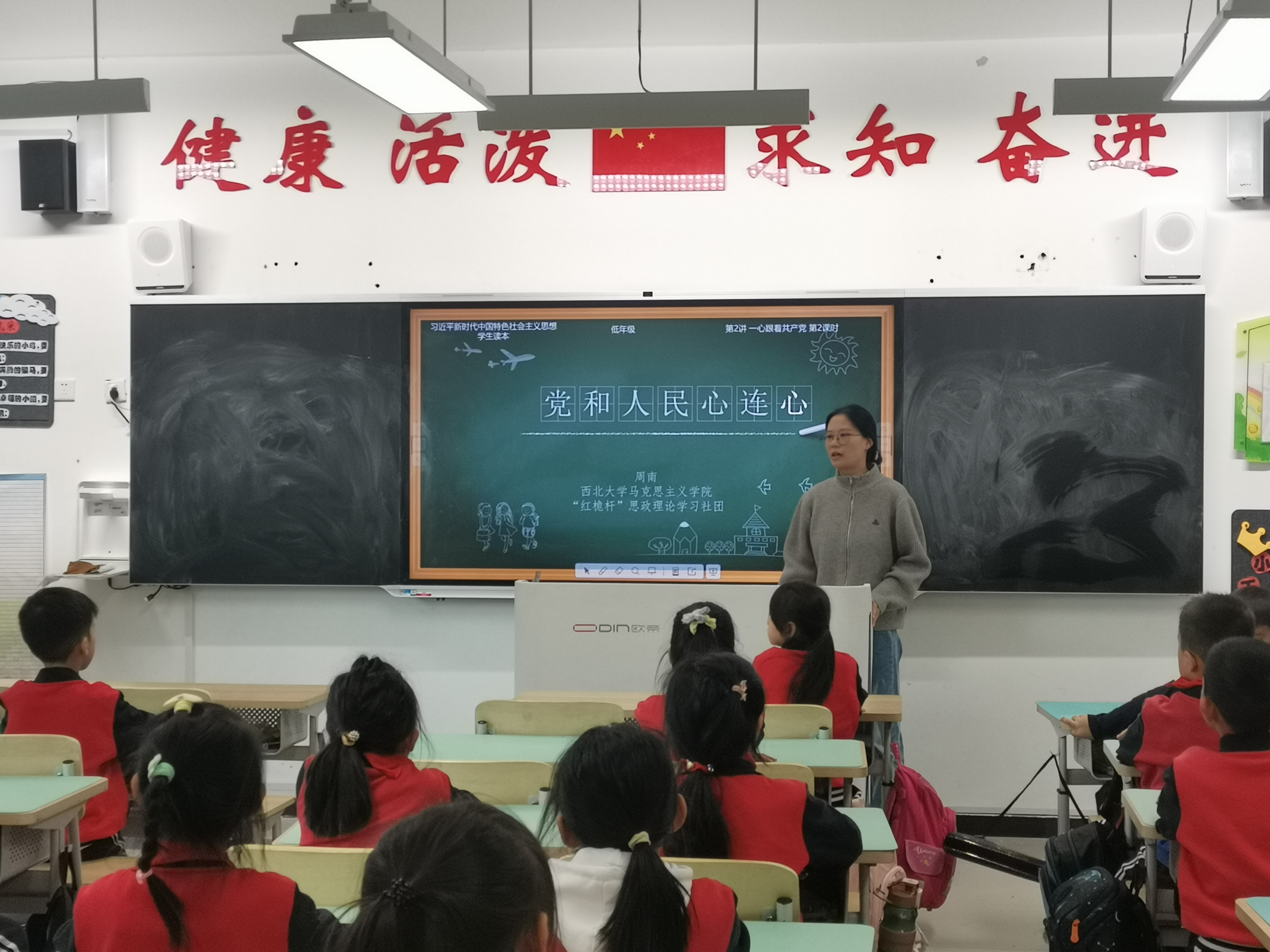 高美娟以《没有共产党就没有新中国》为主题,对中国共产党的成立和新中国的建立做了讲解,并帮助同学们理解了国旗和党旗的含义,更加深入地认识了党和国家的关系。