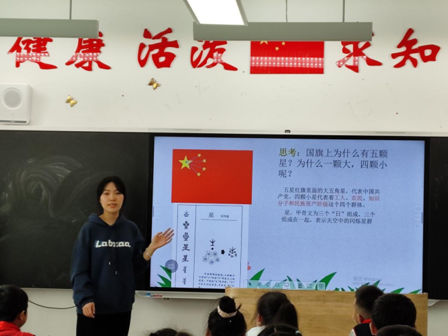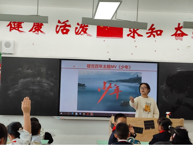 燕卉雅以《光荣的少先队》为题,借助歌曲导入,讲解了少先队的相关知识,倡导同学们从小树立远大理想,明确努力方向,让胸前的红领巾更加鲜艳。