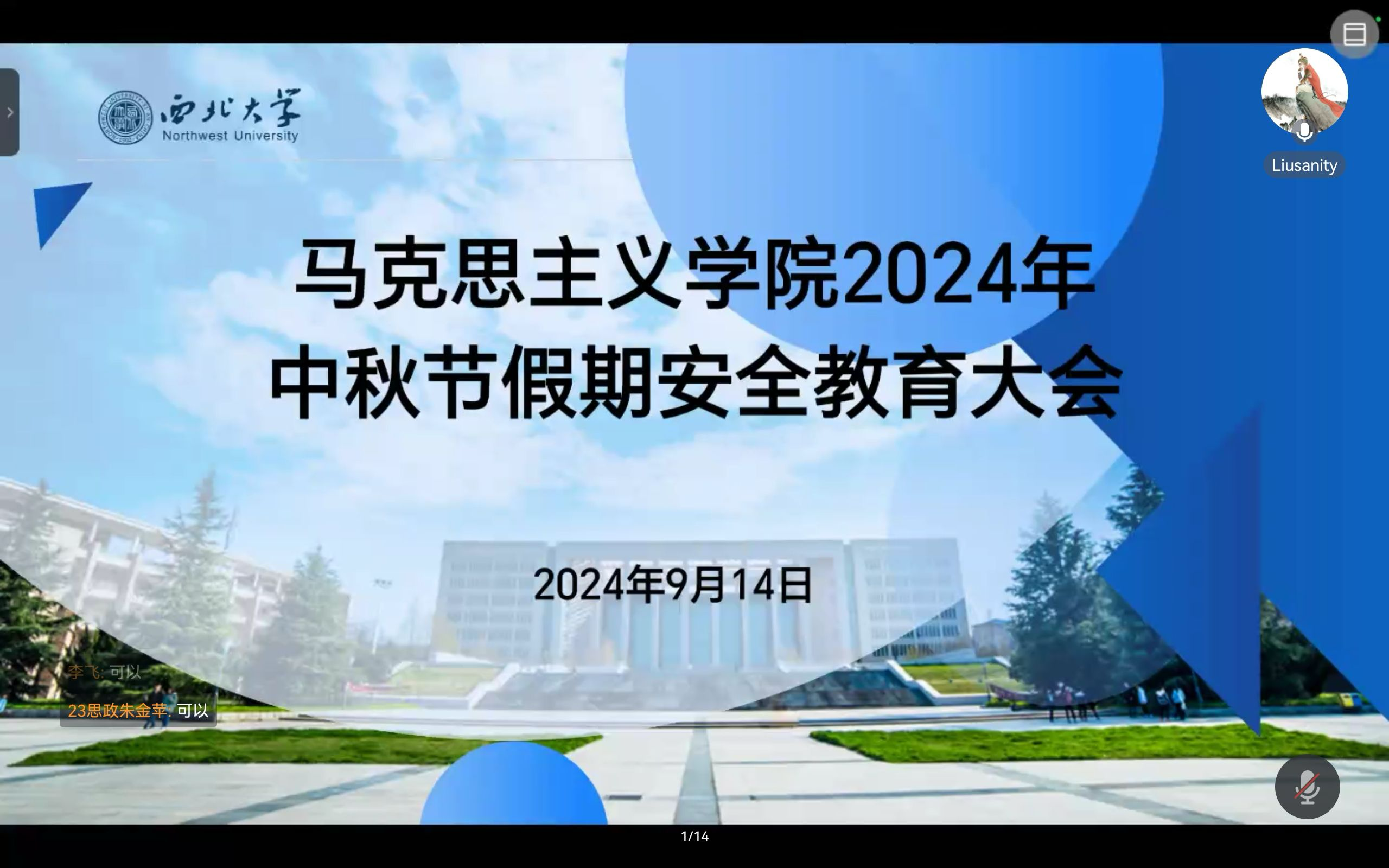 9月14日下午,我院召开中秋节假期安全教育大会线上会议。我院全体研究生参与此次会议,会议由我院党务秘书刘通主持。