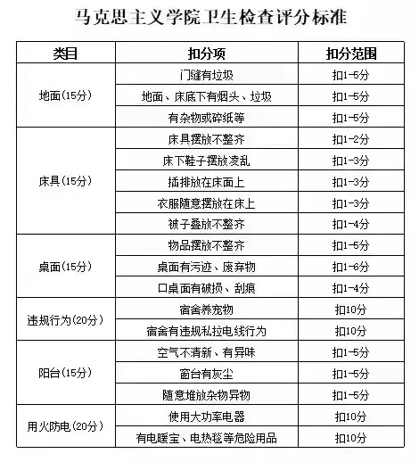 9月18日下午,我院开展宿舍卫生安全检查工作,检查标准如下: