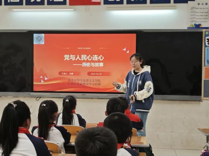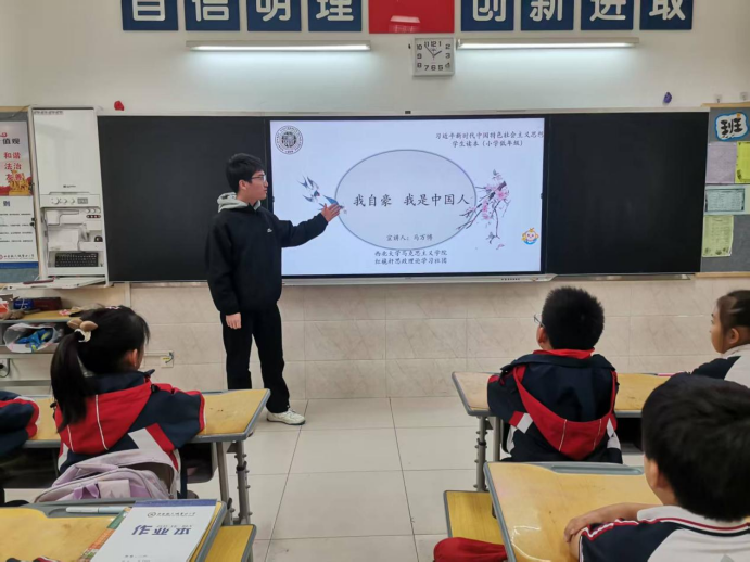 3月28日,我院红桅杆思政理论学习社团在西安航天城第四小学,以《习近平新时代中国特色社会主义思想学生读本》(小学低年级)为主要内容,为三年级的小学生讲授思政课。主讲人是来自2023级和2024级思想政治教育、马克思主义中国化研究、中国近现代史基本问题研究专业的8名硕士研究生。