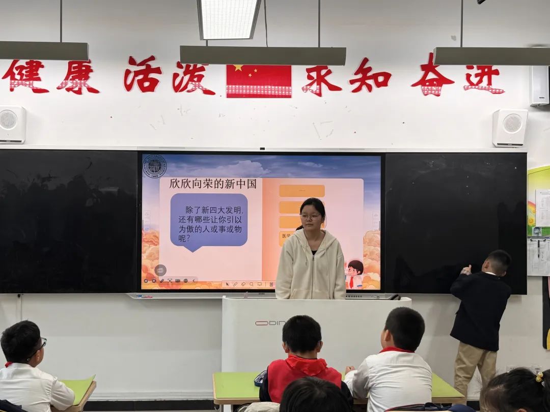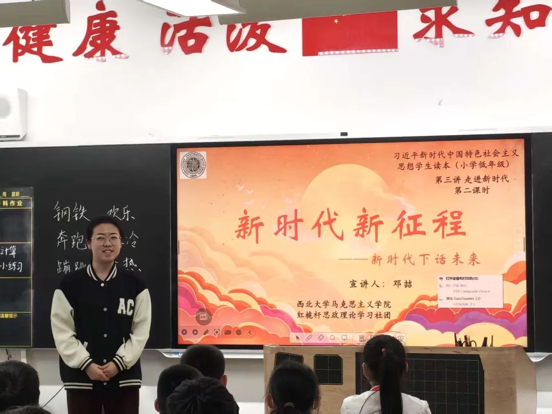 邓喆以《新时代新征程》为题,通过图片、视频等形式展示新时代国家的发展变化;以课堂提问引导同学们深入理解新时代内涵,鼓励同学们立足新时代树立远大理想并为之奋斗。