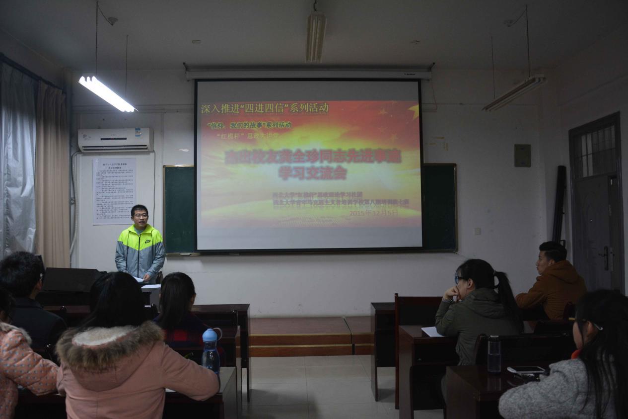 为了进一步深化青年学子对马列主义、毛泽东思想和中国特色社会主义理论体系的认识,强化青年学子的“三个自信”,加强对革命先辈艰苦奋斗精神的充分理解,增强西大学子爱国爱校的情感,西北大学青年马克思主义者培训学校第八期培训班七班与西北大学“红桅杆”思政理论学习社团于2015125日在5214会议室共同举办了题为“杰出校友龚全珍同志先进事迹”的学习交流会。班主任李鑫老师出席并主持了此次学习交流会,七班全体学员参加了此次学习交流会。