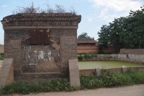 第六天的实践活动开始于充满历史气息的百年老街,结束于充满现代气息的农业观光园。一行十五人穿过村里的小路,看见了路尽头拥有百年历史的涝池。过去,北方大部分村子中间都有涝池,大都是土挖的一个泥坑。但在孝义镇,却有一个石砌花雕的大涝池,可谓是古镇孝义的见证者之一了。泛黄的牌匾上写着保护文物四个字,牌匾有些生锈了。