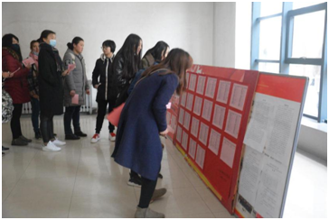 大家在选举前在认真地看宣传板以熟悉流程和被选举人。