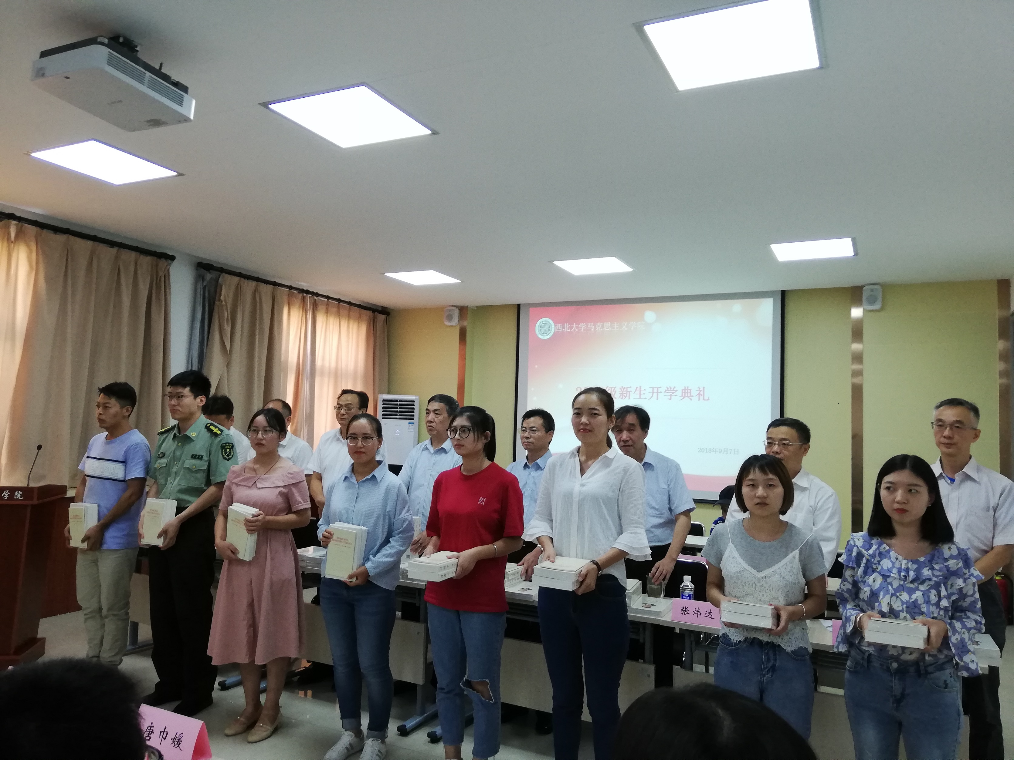 接下来学院领导、老师为在座的40多位新生赠与西大党委提供的教材书籍,这些书籍体现了西大对新生的亲切关怀,寄托着学校对新生刻苦学习、常学常新的殷切期望。