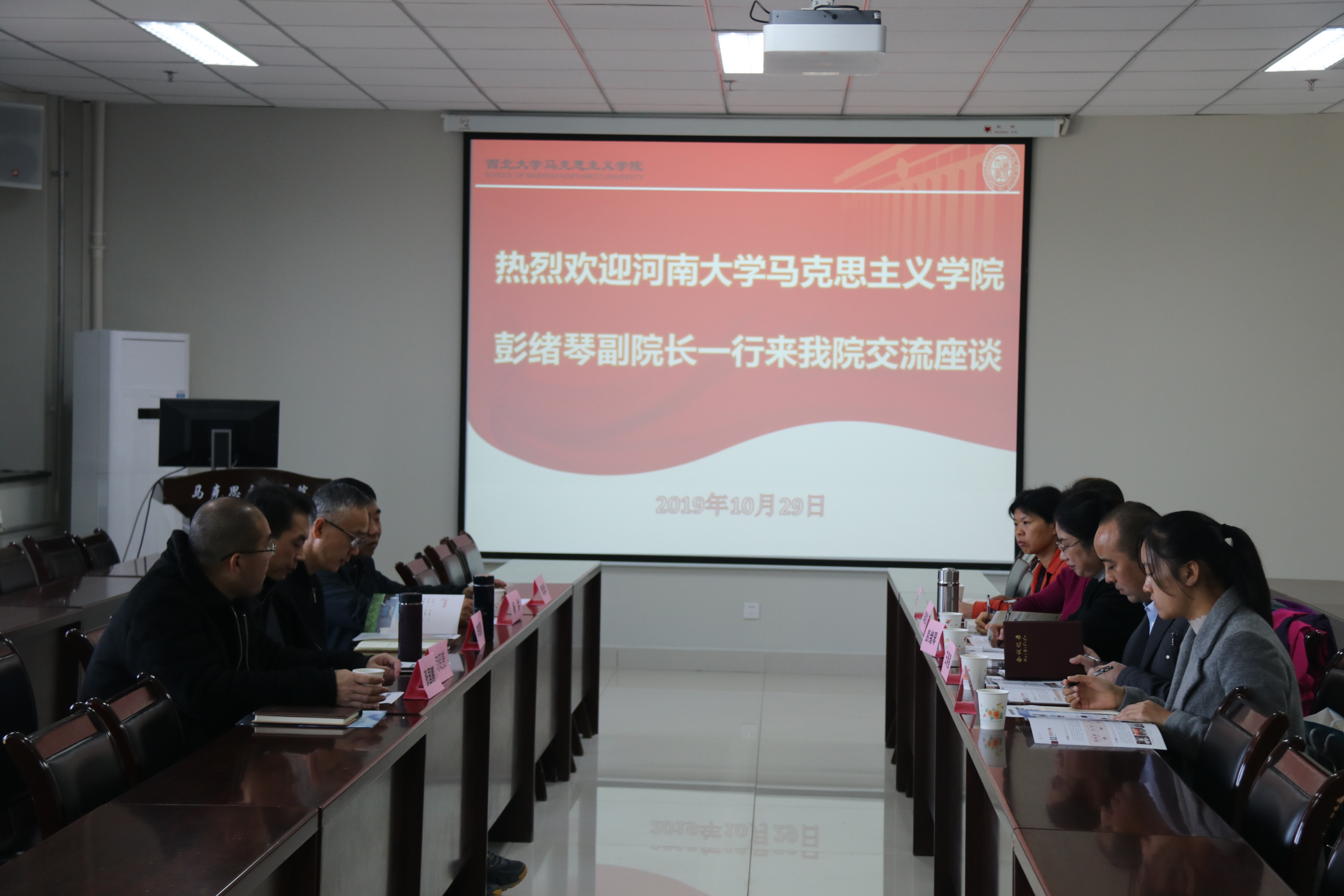 1029午,河南大学马克思主义学院彭绪琴副院长及《纲要》教研室四位老师到我院进行交流座谈。李宪清副院长和近现代史纲要教研部杨洪教授、苟昭赟主任李瑞华老师张国鹏老师参加了座谈会。
