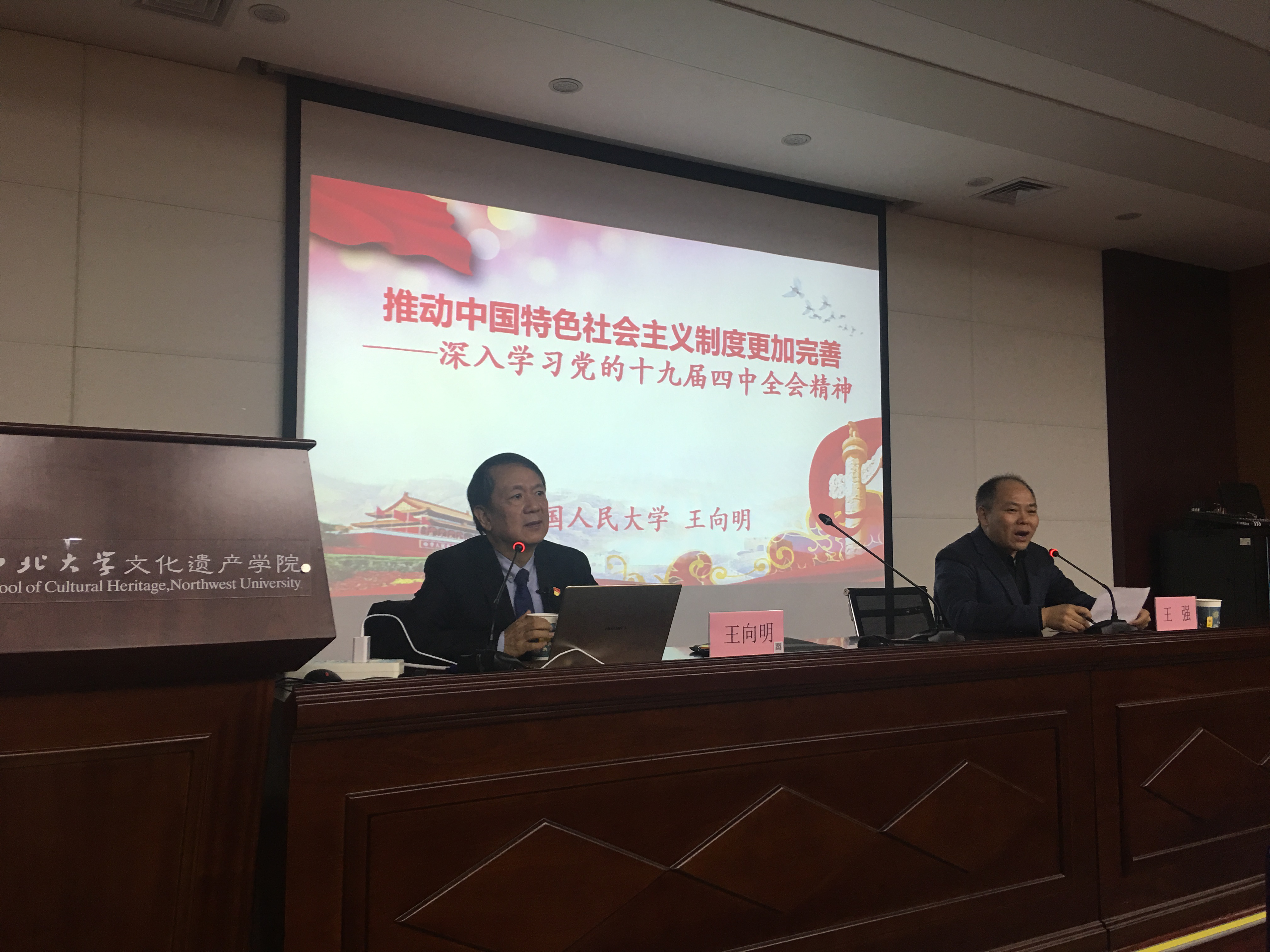 2019年11月26日下午,由我校社科处、马克思主义学院和中华文化干部学院联合举办的形势与政策报告会在太白校区文化遗产学院博望报告厅举行。中国人民大学王向明教授做了“推动中国特色社会主义制度更加完善——深入学习党的十九届四中全会精神”的报告。马克思主义学院王强院长主持报告会,我校师生和中华文化干部学院学员120余人听取了报告。