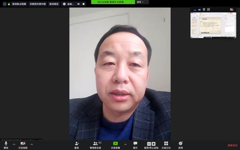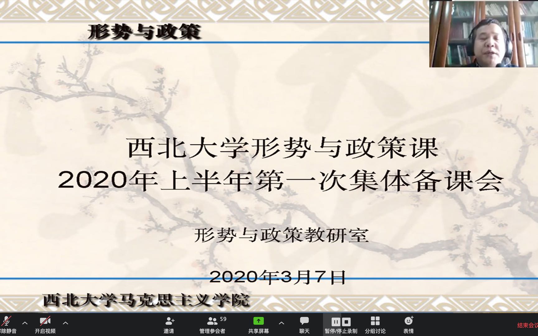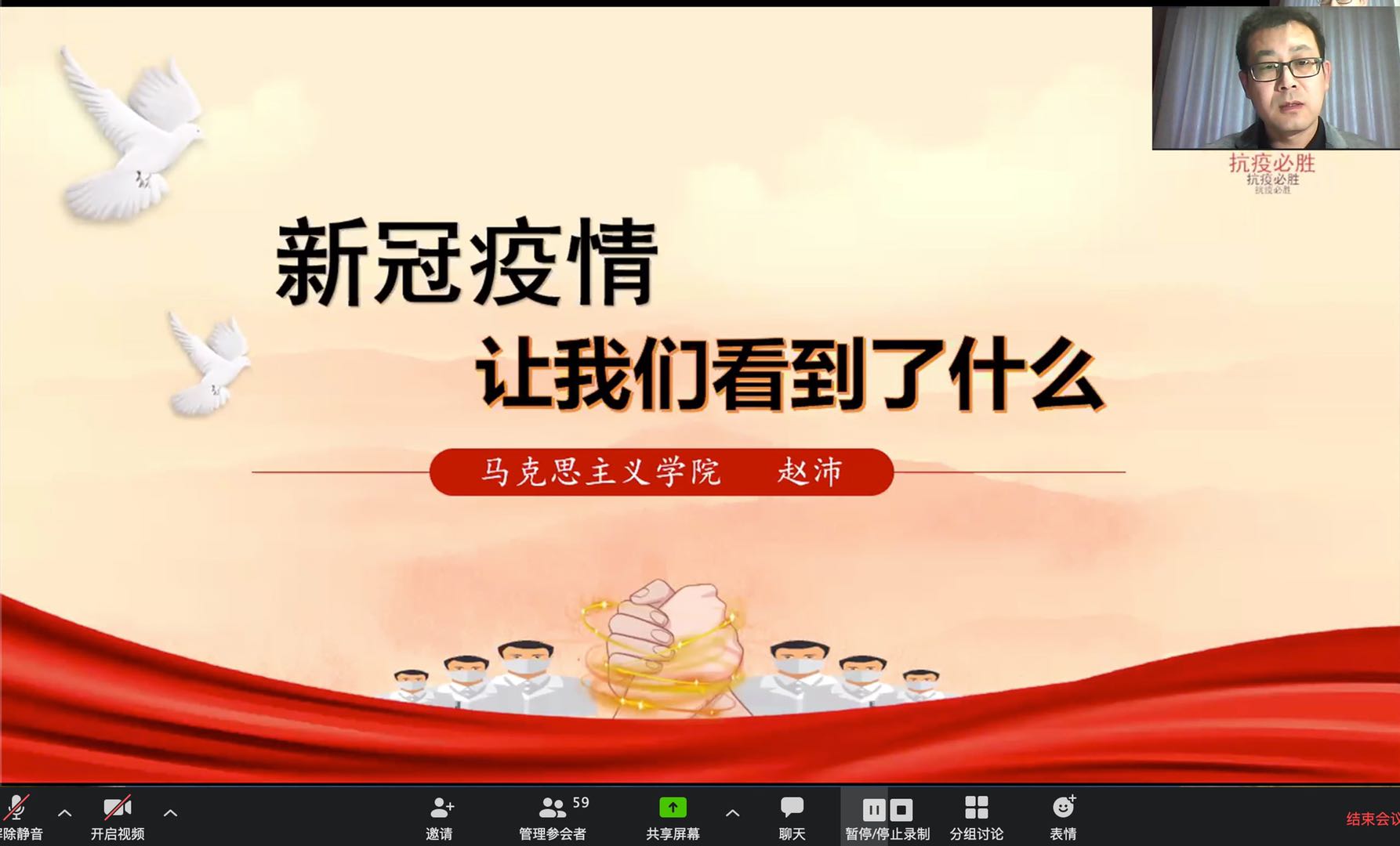 王强院长最后做总结发言,他从如何处理好“危”和“机”、有序和无序、国内和国外、战“疫”和经济社会发展、疫情和宅家五个方面的关系,分析了当前国内外形势,要求各位“形势与政策”课老师在疫情期间认真读书,深入思考,苦练内功,为同学们上好“形势与政策”课,以实际行动为疫情抗击战做出自身贡献。