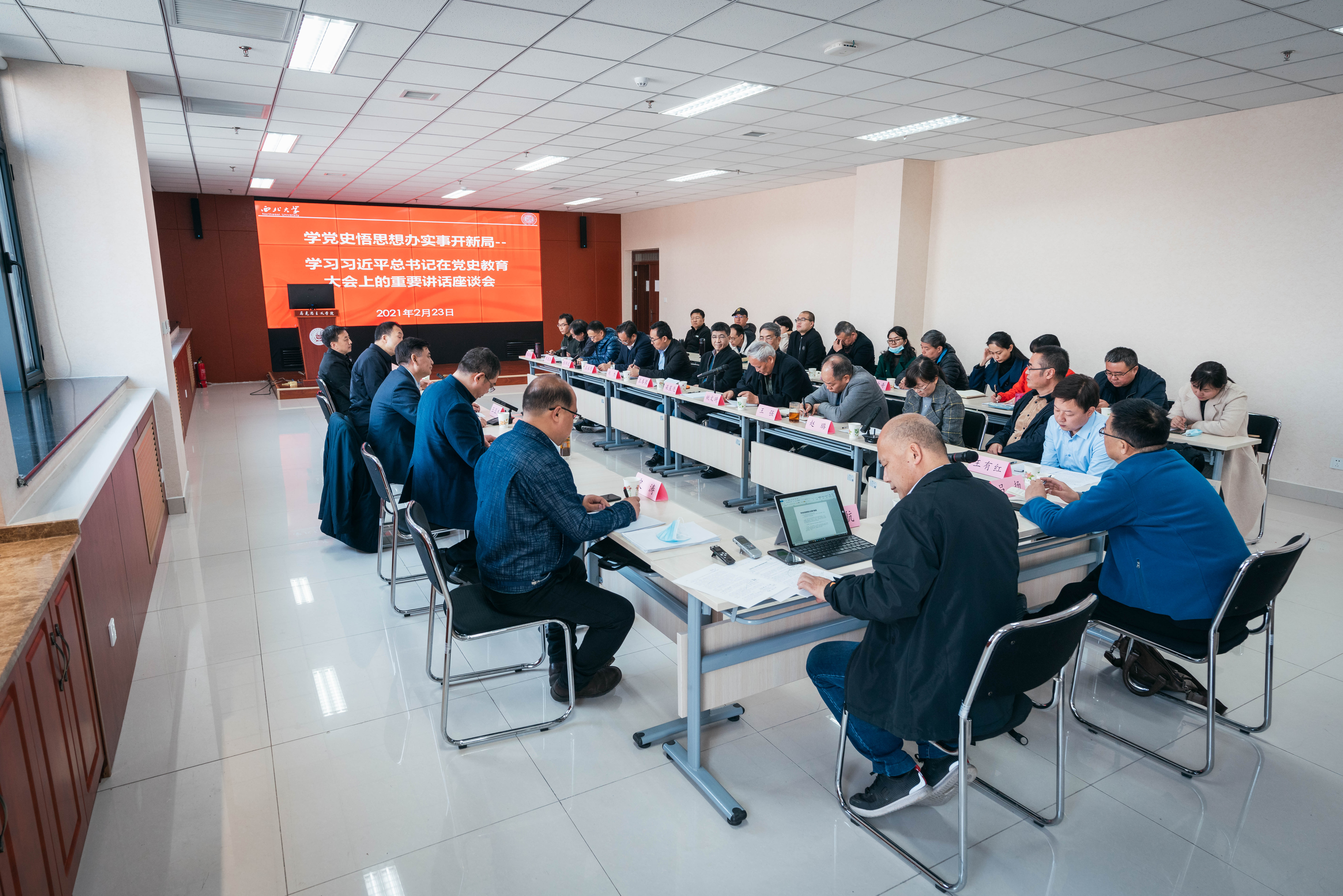 2月23日上午,学校在长安校区召开“学党史 悟思想 办实事 开新局——学习习近平总书记在党史学习教育动员大会上的重要讲话”座谈会。校党委书记王亚杰,校党委常委、副校长常江,宣传部、社科处负责人及马克思主义学院党政班子成员、思政课教师参加座谈,会议由校党委副书记、马克思主义学院院长吕建荣主持。