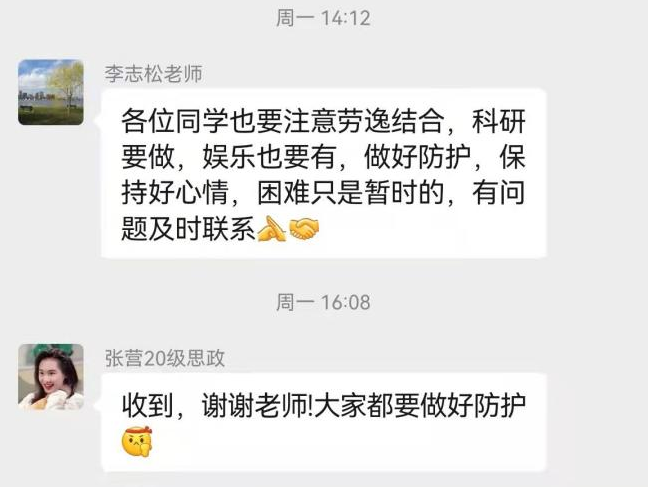 二是抓好导师队伍,导师全面参与学生疫情防控管理。院党委要求全体博、硕导切实负起责任,全面参与、积极配合学院做到学生管理“不漏一人”。学院将全体学生分为6组,由6名院领导带队和导师各负责一组,每个组的工作任务为:一是及时传达各级疫情防控工作要求;二是做好学生思想教育工作,引导学生以积极心态应对疫情,合理安排学习生活;三是结合教学科研要求,每周至少开展一次形式灵活的线上活动;四是了解学生实际困难和需求,及时协调、解决。做到及时关心慰问学生,及时掌握学生思想状况,让学生真切感受到来自学院和导师的关爱和温暖。