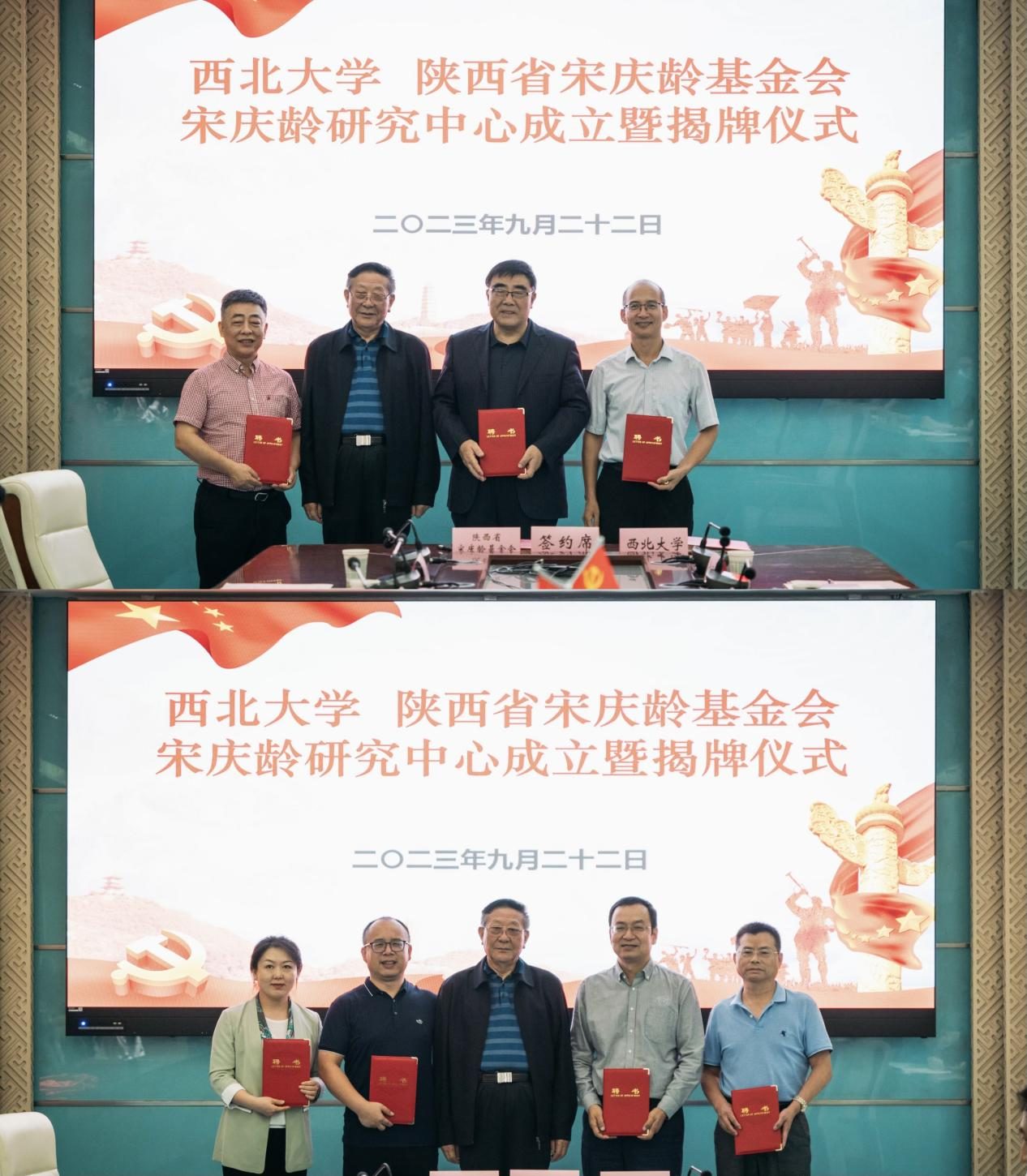 仪式上,朱恪孝与吴振磊分别代表陕西省宋庆龄基金会与西北大学进行签约。罗振江与王亚杰共同为宋庆龄研究中心揭牌。崔延力介绍了协议内容,李丰庆宣读了宋庆龄研究中心成立文件及聘任人员名单。中心为挂靠在我院的虚体研究机构,并聘任何博担任中心主任。罗振江为中心理事会、主任委员会、学术委员会聘任人员颁发了聘书。