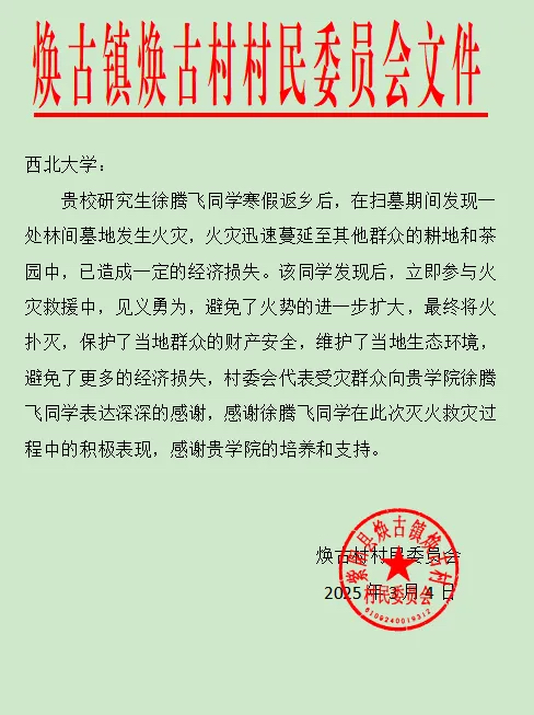 近日,我校收到焕古镇焕古村村民委员会发来的感谢信。信中高度赞扬了我院2023级硕士研究生徐腾飞在危急时刻挺身而出、积极投身救火行动的英勇表现,同时对学校的精心培育表达了诚挚谢意。